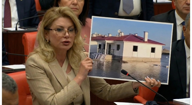 CHP Kadın Kolları Genel Başkanı ve Osmaniye Milletvekili TBMM’de Osmaniye’de deprem konutlarının %19’da kaldığını açıkladı, sel basan konutların fotoğraflarını göstererek tepki gösterdi.
