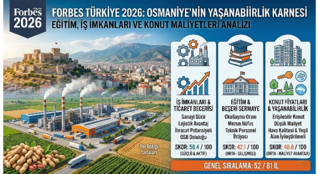 2026 raporuna göre Forbes 2026, Osmaniye, yaşanabilirlik endeksi, iş yapma kapasitesi ve şehir sıralaması başlıkları kentin performansını şekillendiren temel kriterler arasında yer aldı.
