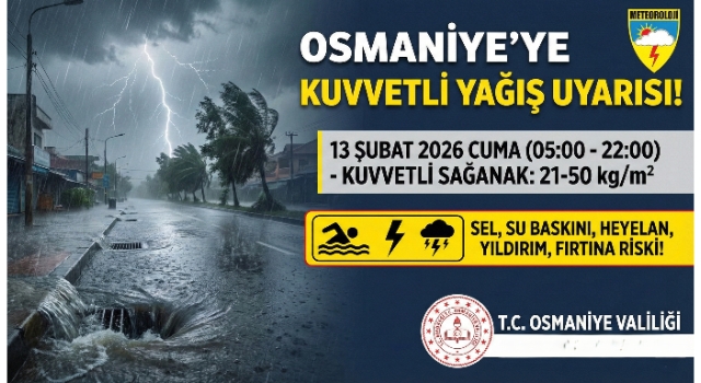 Osmaniye’de 13 Şubat Cuma günü sabah saatlerinden itibaren kuvvetli sağanak ve gök gürültülü yağış bekleniyor. Valilik, sel ve su baskınına karşı uyardı.